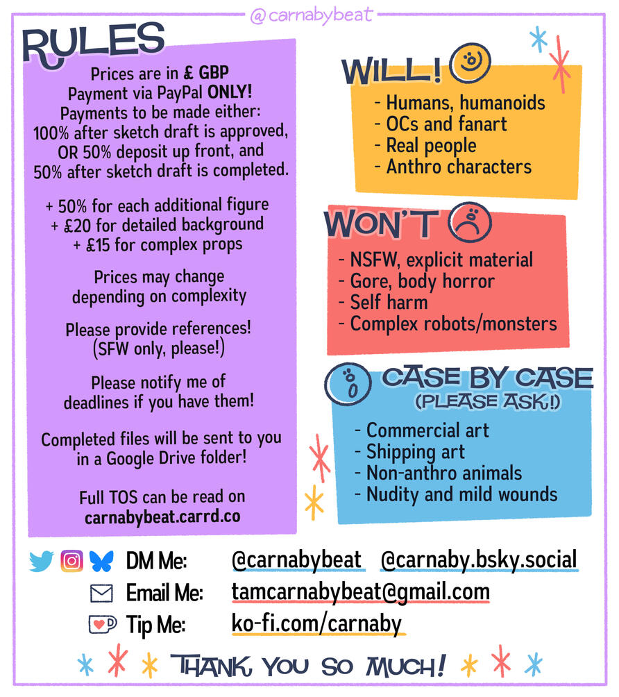 Hi, I'm Tam / Carnaby! I'm an illustrator based in the UK.Welcome to my commission info site!